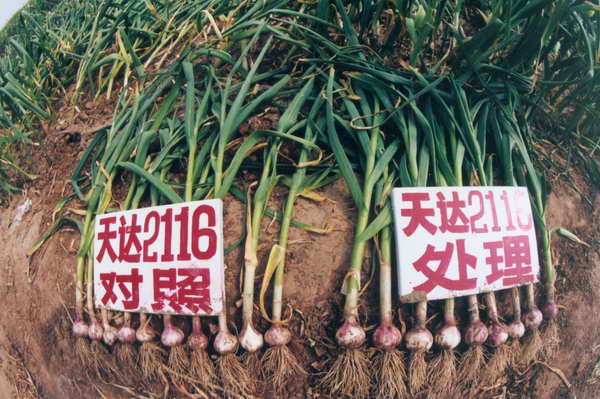 高密市夏庄镇高家店高青 田内,大蒜试验对比情况, 处理比对照增产21.1%。 1999年5月19号