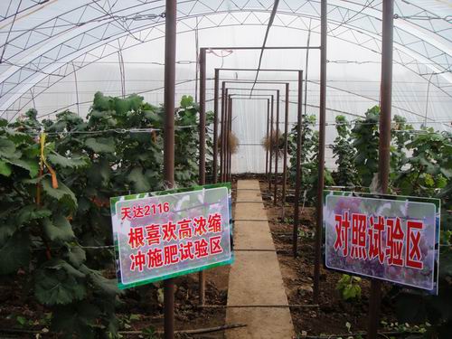 平度市大泽山葡萄基地内 使用“天达-2116”处理 的葡萄长势情况。 1999年8月7日