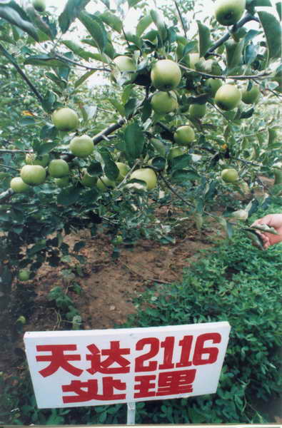 山东栖霞大庄头乡大庄头 村柳忠胜苹果园内用“天 达2116”处理后的苹果。 1998年9月28日