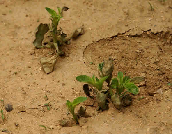 绥中高岭土豆遭受除草剂药害后, 喷施天达2116四天后的土豆。 2008-5-11